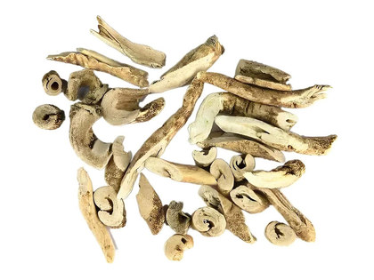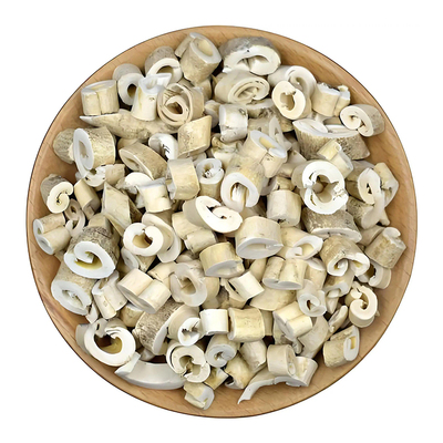 本品呈不规则的厚片。外表皮灰白色或淡灰黄色,具细纵皱纹及细根痕,常有突起的颗粒状小点;内表面类白色,有细纵纹。切面类白色,略呈层片状。有羊膻气,味微苦。